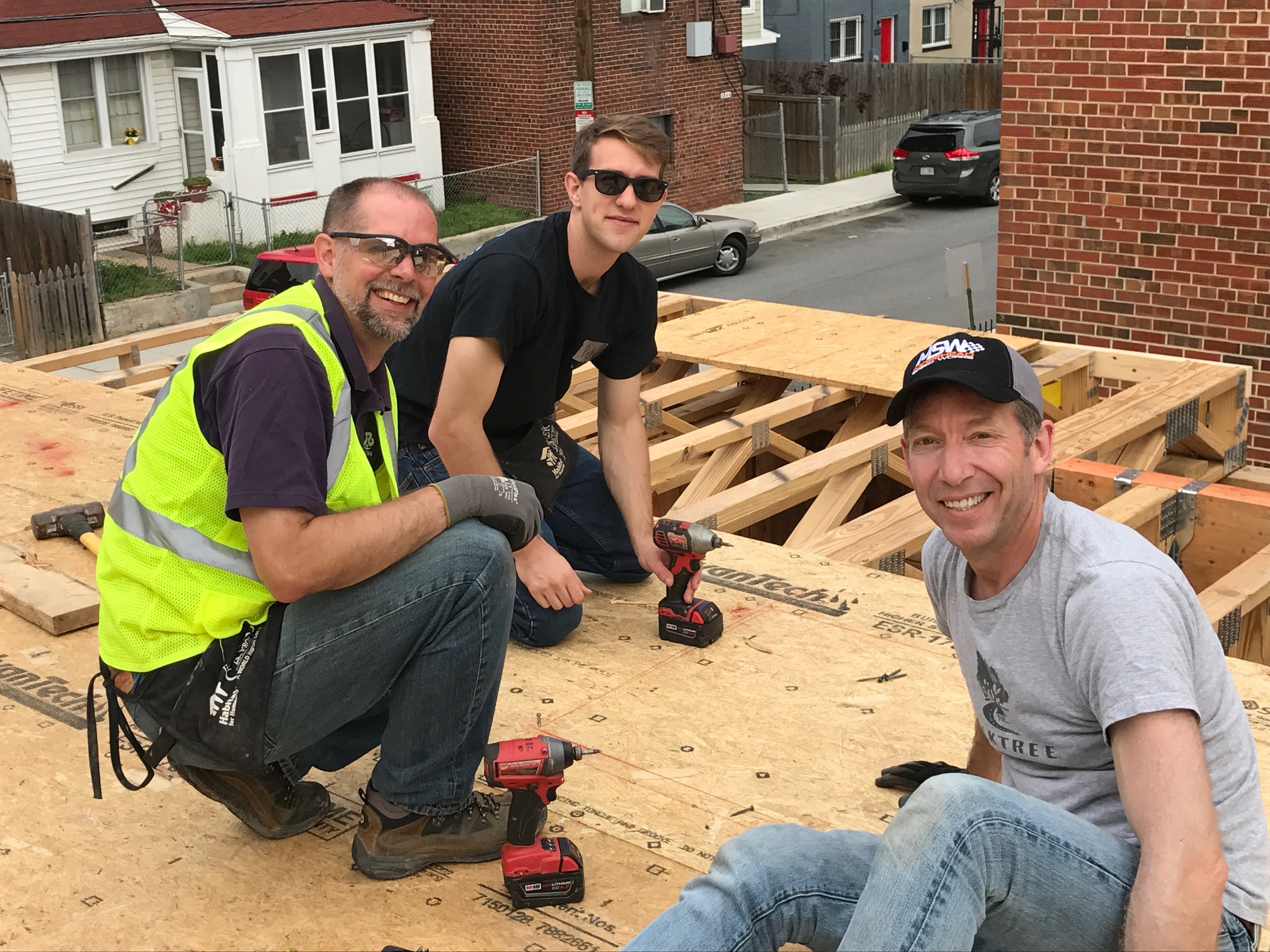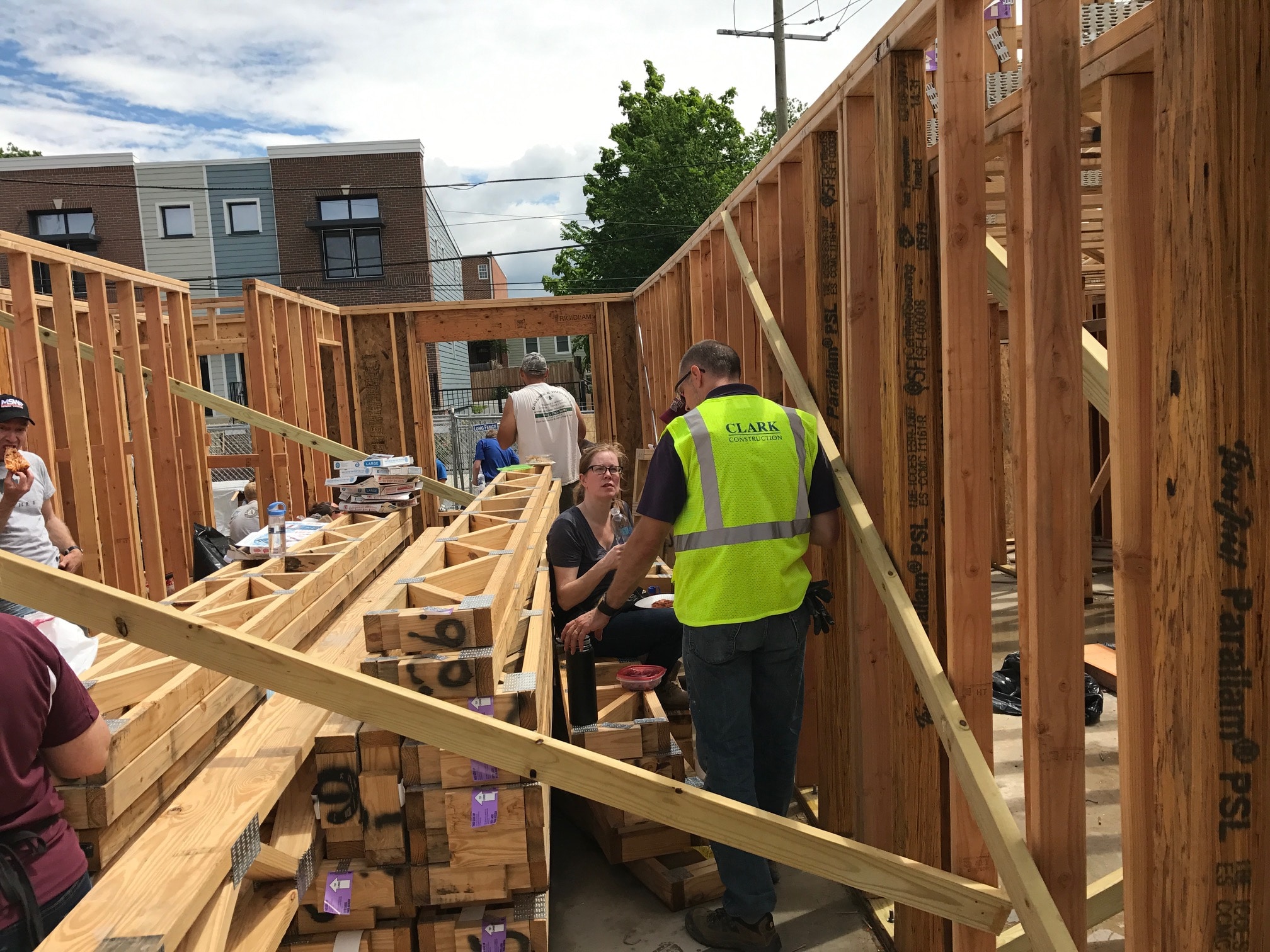Demonstrating that good partnerships go a long way, in May, and again in July, of 2017, FCP volunteers teamed with Clark Enterprises, Inc. (CEI), Level 2 Development and Clark Construction (partners in the Highline project) to work on framing for four Ivy City, DC rowhouses with Habitat for Humanity.