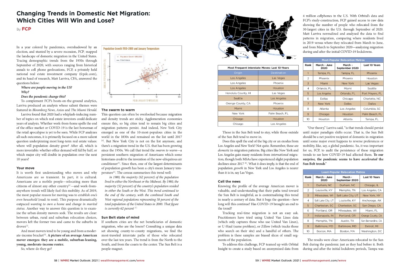 Wealth Management Real Estate (WMRE, formerly NREI) recently showcased FCP’s Vice President of Research and Data Analytics, Matt Larriva‘s, work on domestic net migration during the pandemic.