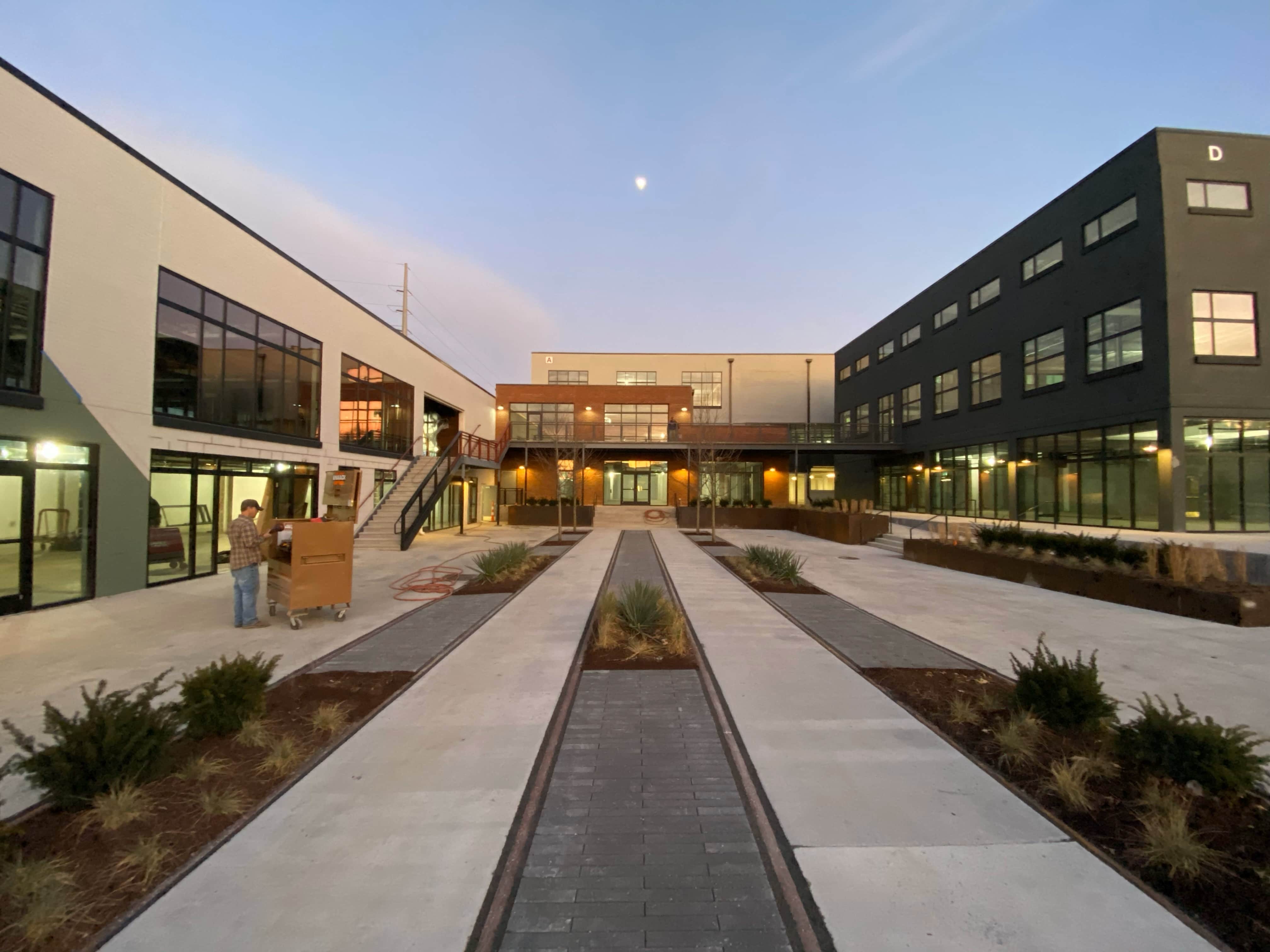 The open-air corridors and terraces connecting the six buildings that formerly made up Madison Mill, provide integrated, outdoor workspaces for tenants designed to foster a collaborative and active workplace.